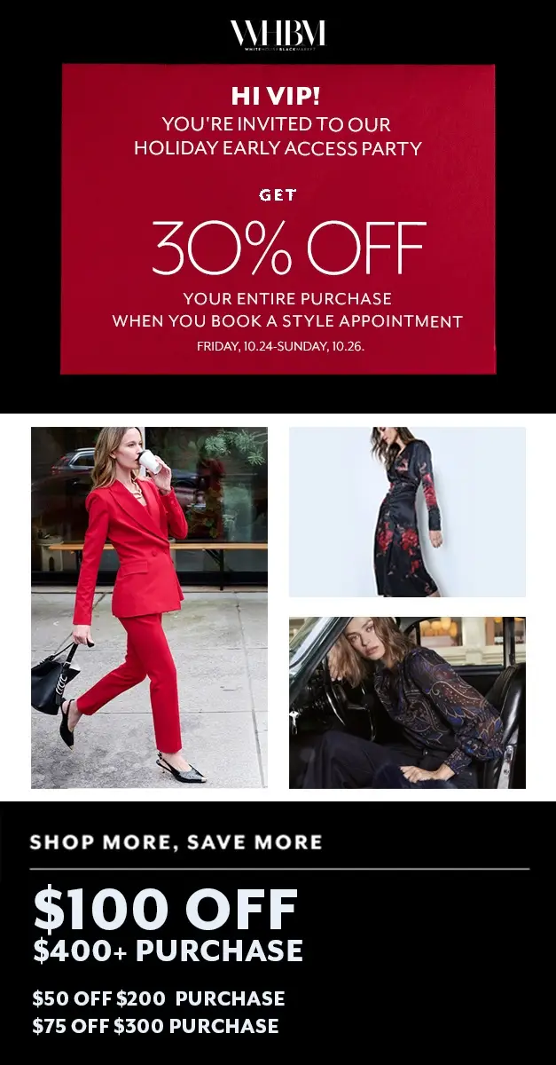 Head over to White House | Black Market from Friday, October 24 to Sunday, October 26 for their exclusive holiday early access party! Enjoy 30% off your entire purchase when you book a style appointment. Call (813) 994-3222 to book your appointment!