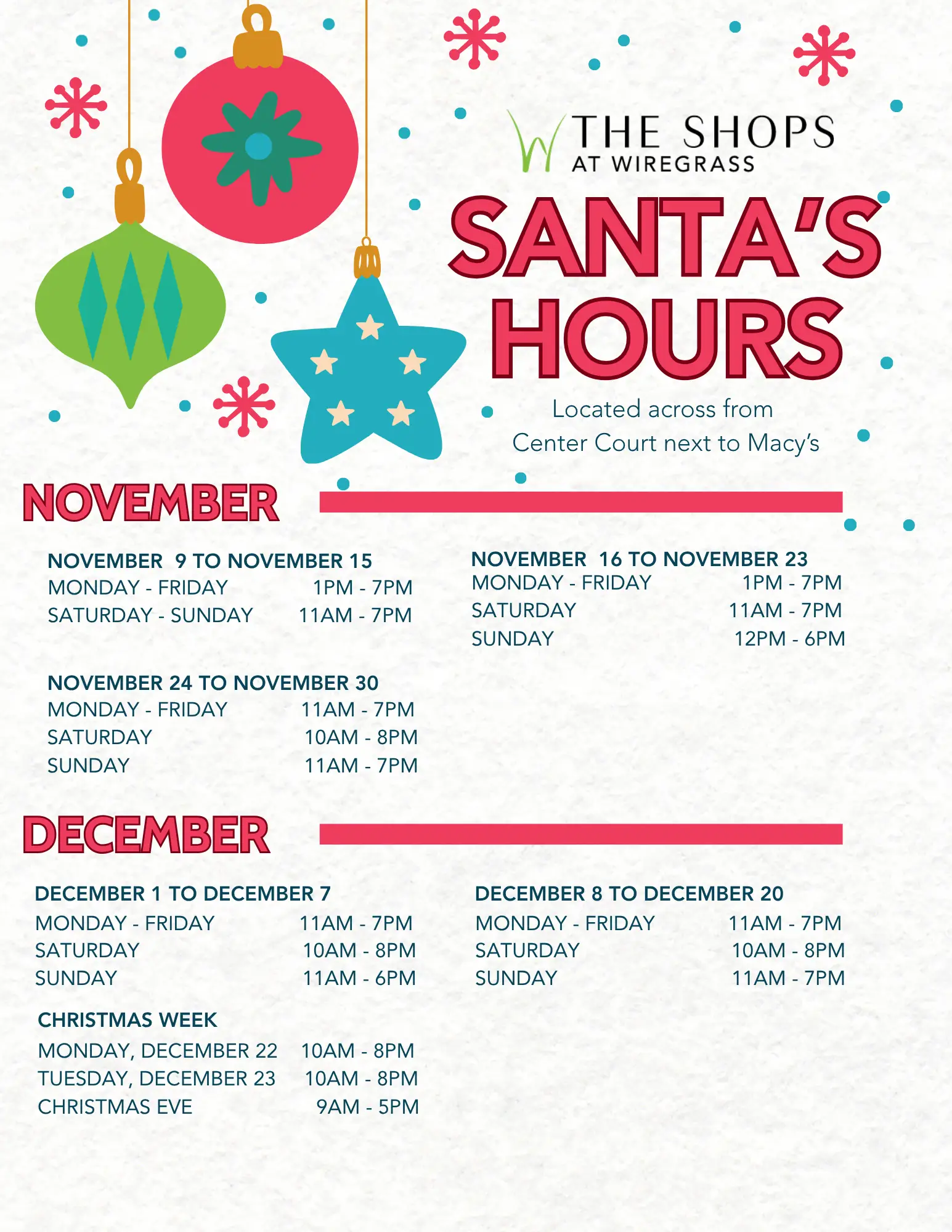 Whether it's your first holiday season or a lasting family tradition, we are excited to welcome you to The Shops at Wiregrass Santa Photo experience! Santa photos will be taking place INSIDE in between Warby Parker and Victoria's Secret across from Center Court from November 8 to December 24.
